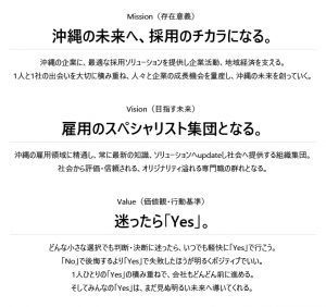 私たち求人おきなわは、社会に提供したい価値と目指す未来を明確にするために、これまでの企業理念を刷新し、社員と経営層が一体となって「Mission・Vision・Value」を策定しましたことをお知らせいたします。
